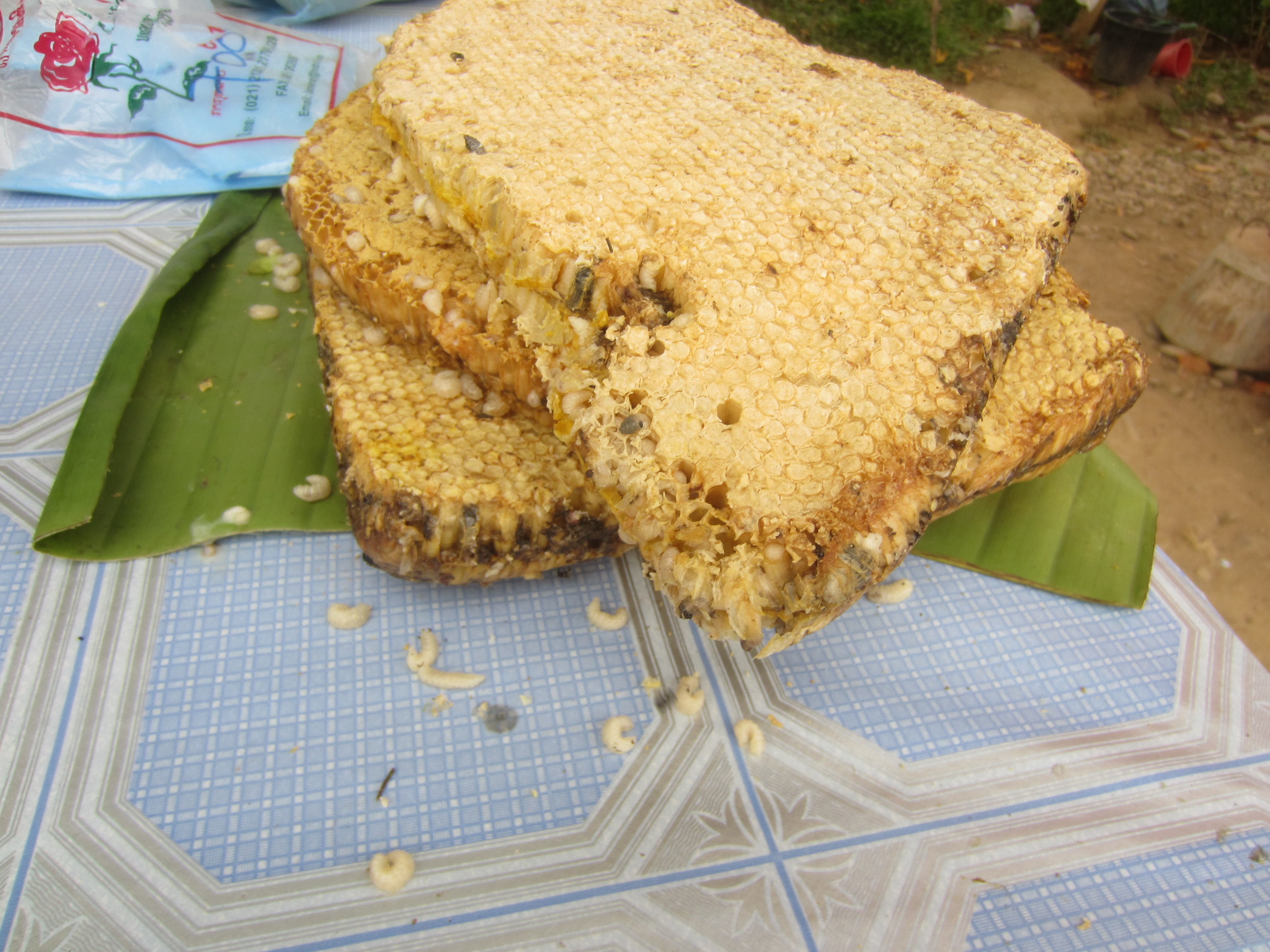 Wrapped in pandanas leaves, straight from the grill, this new dish looked pretty good. But as Marcel slowly started to unwrap the honeycomb, I looked back at the grill and noticed something strange: there were bug larvae on top of those honeycombs.