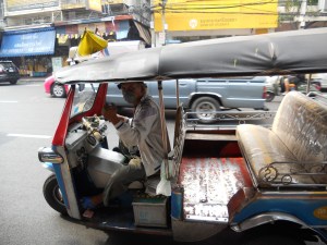 Bangkok tuk tuk driver covering his nose and mouth while driving around Chinatown