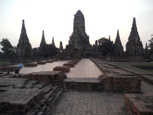 Later that day, Josh and I joined some other travelers at our guest house for a boat tour of some of the ruins off the island. This was pretty fun. Our non-English speaking guide drove us around this long, canoe-like boat and dropped us off at random places with virtually no explanation, simply saying “20 minutes.” Luckily, we managed to find Wat Phanan Choeng, home of another MASSIVE Buddha, Wat Yai Chai Mongkol, a smaller, less impressive temple with an old chedi, and Wat Chai Wattanaram, the most picturesque of them all. Wat Chai Wattanaram was absolutely gorgeous. Of all the ruins we’d seen, this one seemed the most intact, the most symmetric and was, surprisingly, sparsely populated with tourists. We were there around sunset and the whole thing made just a beautiful silhouette against the sky. It was a great way to end our tour. Next stop, Kanchanaburi!
